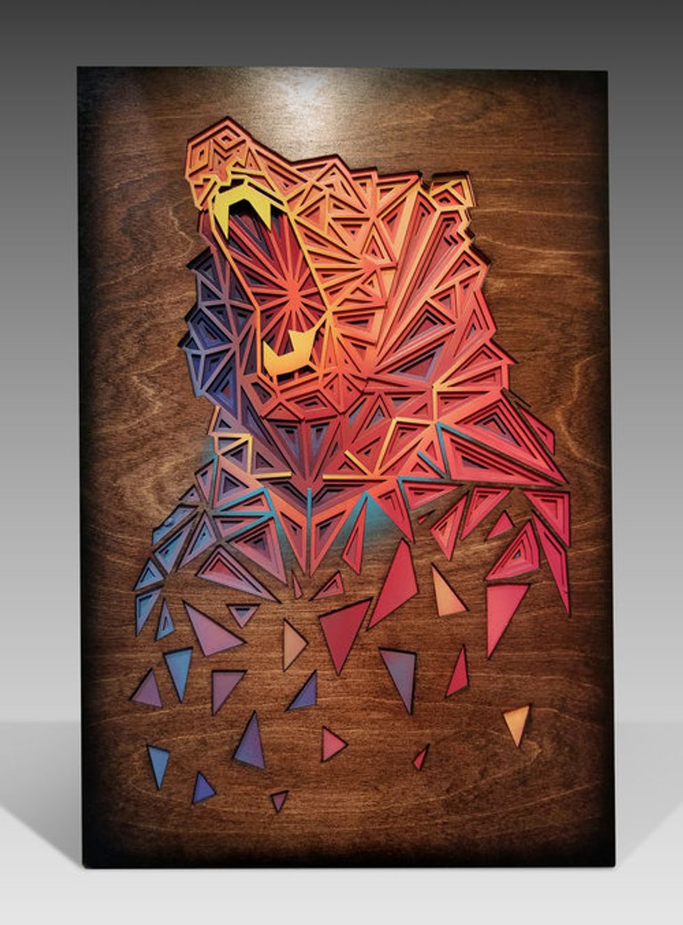 As I did more research on Shadowfox, I learned that each composition is unique and painted by the artist. In class, we had just had a conversation about prints and how they are affecting the art world. Some believe that duplicating art, for example, by covering paint on canvas, to a photograph, makes the art itself lose value and meaning. I myself would have to agree with this. By creating original, unique art, I believe that it has much more meaning and because of that, an artist can connect with its viewers on a much more personal level.Shadowfox does just this by creating such different works of art, clearly unique to one another. As a mixed media artist, I enjoy the way Shadowfox combines both wood and paint to create depth and vibrancy. You can find on their site that they are "more than art" by offering more services than just these Shadowboxes, but also wood sculptures, up-cycled earrings, wooden pendants, lanterns, light pendants, design services, laser cutting/manufacturing services, and last but certainly not least, free high-fives and hugs.
