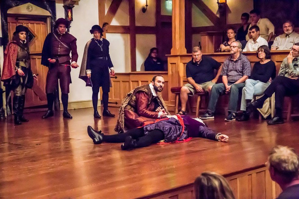The reason all of this eye-contact and audience interaction works so well is because it’s actually how Shakespeare intended his plays to be performed. They didn’t have the ability to turn off the lights and spotlight the stage in his day, so through necessity, the room was lit with candles and sunlight. But playwrights, Shakespeare in particular, used this to their advantage. He wrote his lines with an active audience in mind. He used lyrics of songs that everyone knew. His “asides” were meant to be given directly to viewers rather than the empty air. He meant for his audience to be part of the play.