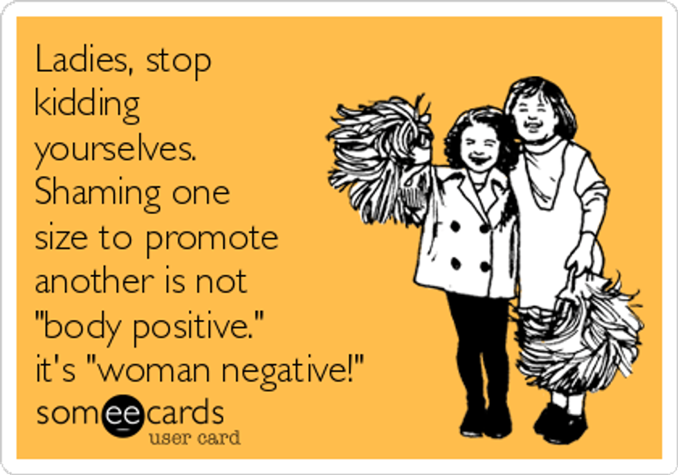 I feel like society has taken one step forward, two steps back when it comes to shaming people regarding their weight. Having curves and a booty are in. People are starting to stand up to those who did fat shame and take a stand against the modeling industry for only praising stick thin girls. Heavier people are starting to be able to feel more comfortable in their bodies but for some reason, this opened the door for skinny shaming. The same people who were putting the modeling industry down are now sharing pictures on Facebook claiming that "real women have curves" and "only dogs like bones." These people have become the people they took a stand against and that's not OK.