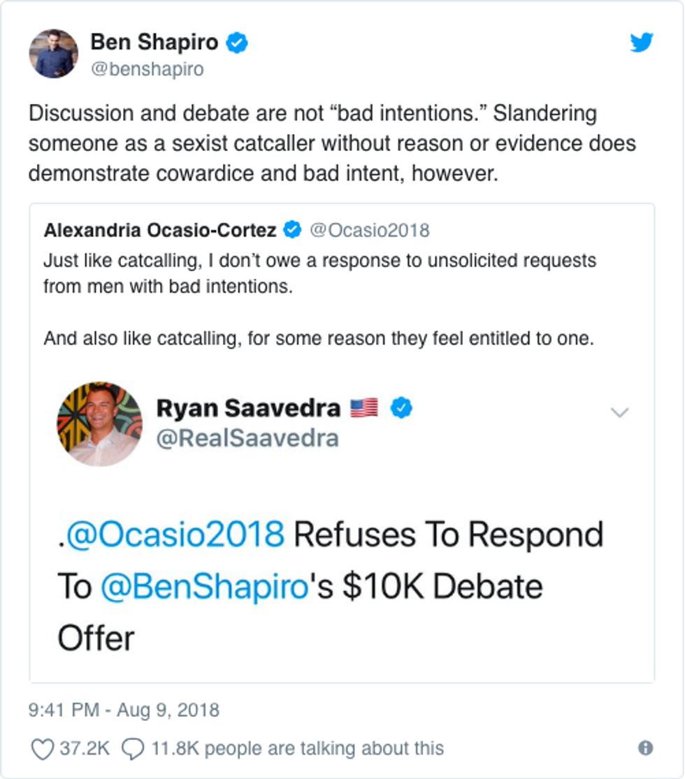 Shapiro is a 34-year-old conservative famous for his controversial challenge to transgenderism and abortion during a viral Q and A at Ferris State Authority. In a recent show on the Daily Wire, a right-wing news outlet founded by Shapiro, he invited Alexandria Ocasio-Cortez to a political debate. He insinuated that she believes Republicans dislike debate while assuring her he is "eager" to engage in a conversation discussing policy. So eager, in fact, he offered $10,000 to her campaign or to charity if she agreed to a debate. Ocasio-Cortez, a 28-year-old Democratic US House candidate in New York, promptly refused to debate by firing back with a tweet comparing his request to a catcall.
