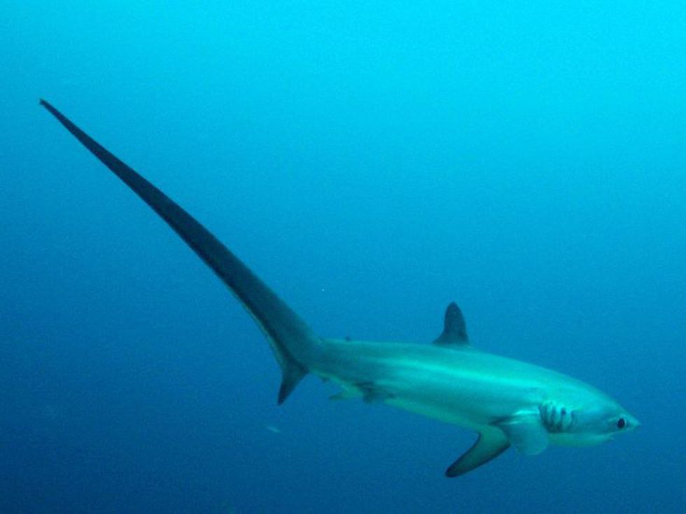 The Thresher shark possesses an extremely large tail. It accounts for 33 percent of the shark's total body mass. The tail alone, can way up to 800 pounds and is used to navigate the water by violently thrashing.