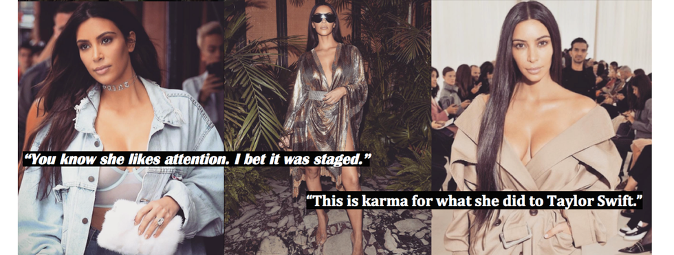 Can we just stop? The woman is confident in her body and owns it, she cropped her daughter out of a selfie, and she has had lenses surrounding her since she was a teenager; in what way does that make her to blame, at all, for being robbed at gunpoint? In the days since Kim Kardashian-West was robbed at gunpoint in her Paris apartment during Paris Fashion Week, she has once again resumed her role as a hot source for gossip and speculation around the world. I read a few of the articles about her in the aftermath of the ordeal. In most of them, these publications commented on her celebrity on her hit television show, Keeping Up With The Kardashians. She was lauded as a media personality and fashion icon, as well as being recalled as the wife of rapper, Kanye West. But it wasn’t just these articles that bothered me. On my college campus, I heard a group of young women discussing the robbery while waiting to order my lunch one day last week. I heard one individual remark, “Well, when you put your life out there, you can't be surprised when something like this happens.” Another member of the group quipped back with, “If it even happened, you know she likes attention. I bet it was staged.” What followed was murmurs in agreement and after a few moments passed, I heard another student chime in with the remark that inspired this article: “This is karma for what she did to Taylor Swift.”