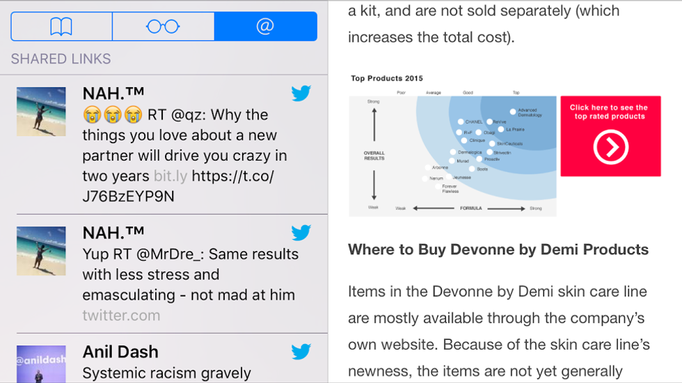 What the f*** is this? For those of you without iPhones, this sh*t automatically pops up and takes up half of the page you're reading when you turn your phone to the side. When you have Apple's (default) "suggested reading" mode on, Apple takes it upon itself to clot half of your screen with either shared links, saved pages, or....Twitter. That's right, Apple thinks that I am such an incompetent dipsh*t that it's basically telling me, "Hey Sarah, I know you really want to be on Twitter right now. F*** off with whatever you're doing." I turn my phone to landscape mode because sometimes it's the only way you can zoom in on something if the website has a poorly designed mobile site. It isn't secret code for "gee, I wish someone would suggest I piss around in a slightly different way than I am right now." Remember which one of us is the being capable of autonomous thought here, iPhone.