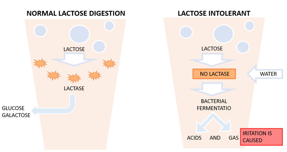 After infancy, the mechanism for creating the enzyme lactase in humans turns off. This means that there is no enzyme to break the lactose from milk into its sugar components, glucose and galactose, so that it can then be used for energy. Instead, it has to pass through our system undigested where it can ferment and create discomfort known as "lactose intolerance." Since the lactase producing mechanism turns off, everyone becomes intolerant to milk as they grow older. Despite the fact that we cannot digest a major component of milk, we continue to drink it and deal with the discomfort.