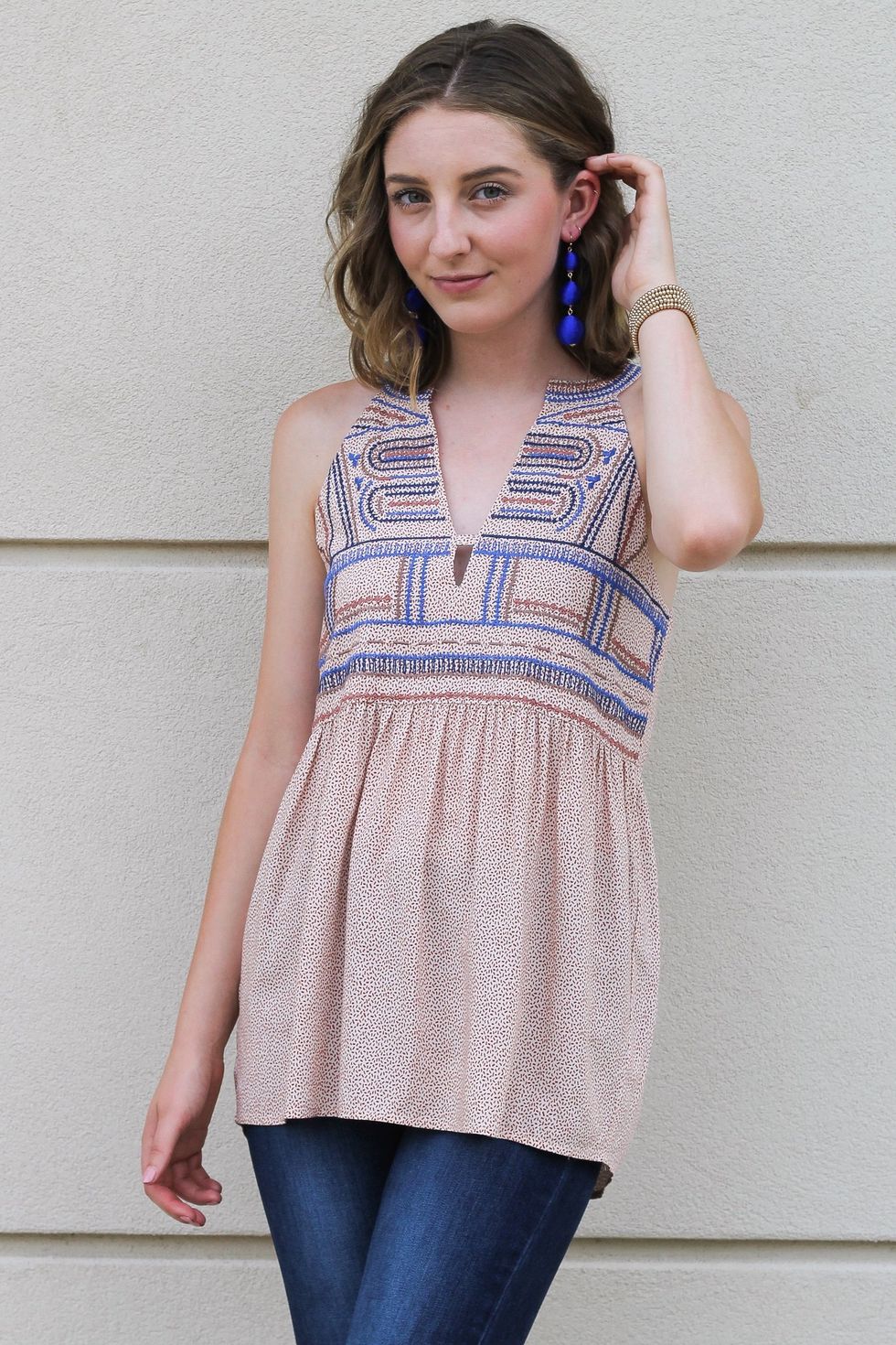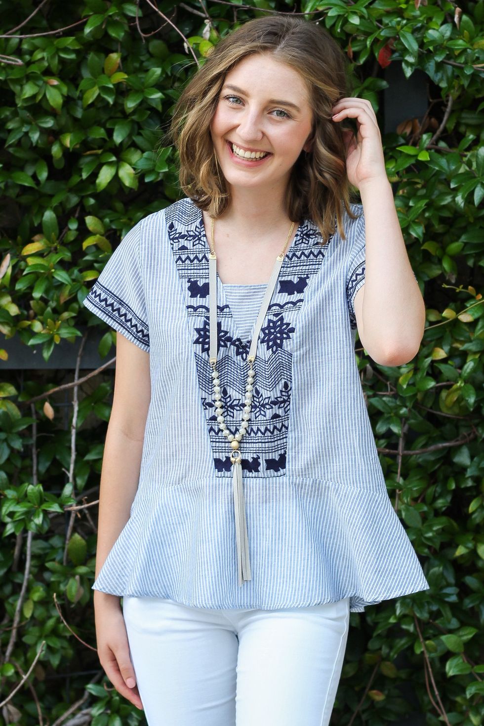 This top would be great for some of those August and September Carolina football games! It's a little on the summery side with the light colors and stripes, but you can take this top all the way through fall by pairing it with a nice dark-wash jean that complements the deep navy embroidery. When I saw this top in store, they had already sold out in my size! Get yours while they last.