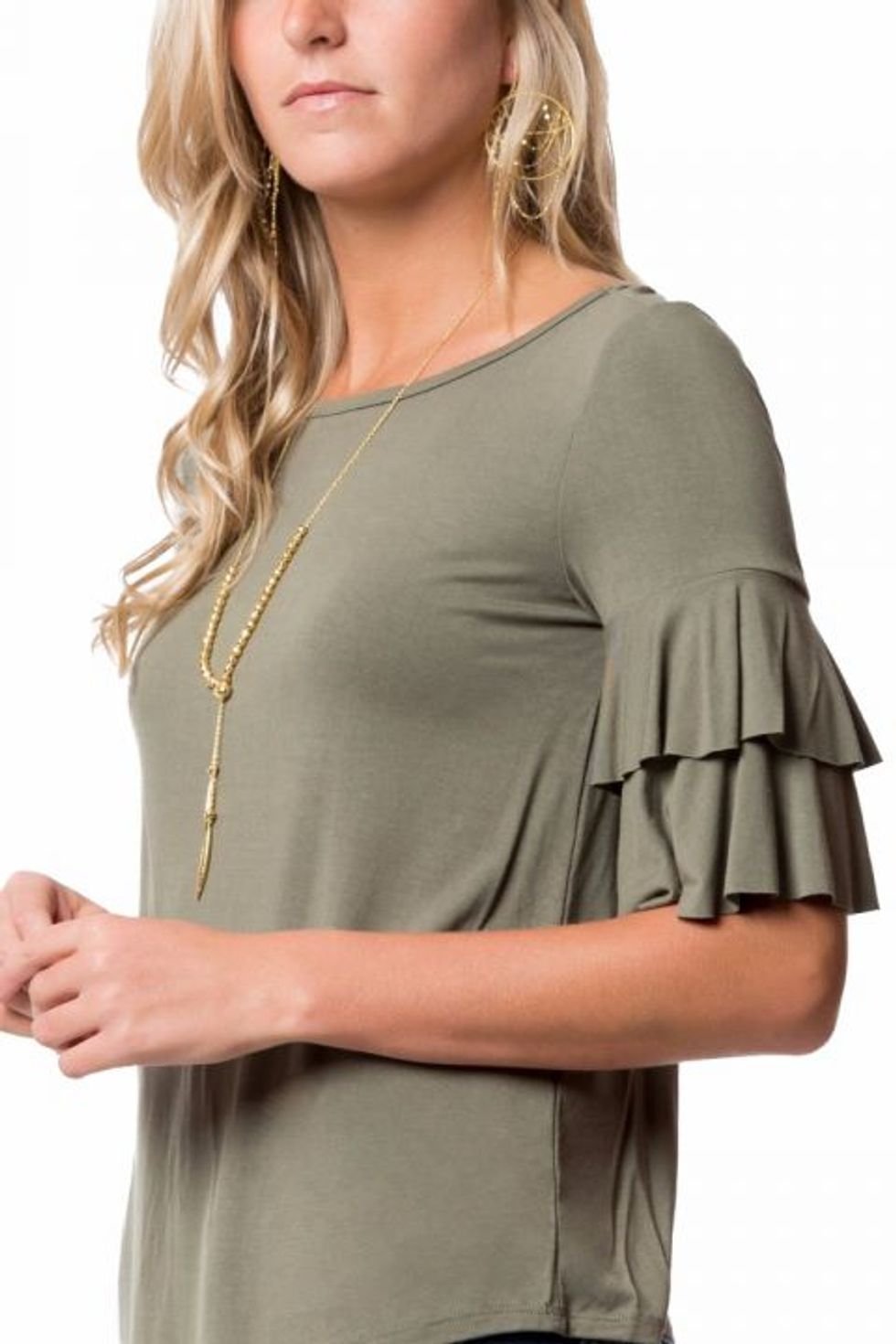 This army green tee has all the feminine details of a nice blouse with the soft, comfy fit of a tee shirt. Not only do the sleeves feature ruffles but the top also has a scooped back that shows off your shoulders. The color is perfect for fall and the sleeves won't get in your way like a lot of other flared styles will. I always like to pair this green with gold accents and neutral tones. For those early and warm fall months, pair this top with a pair of distressed denim shorts or skirt and once it gets a bit cooler, swap out the short bottoms for your favorite pair of jeans and tan booties.