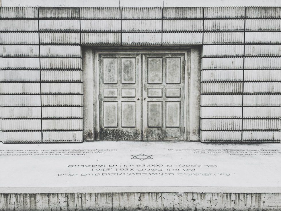 The text in front of the door reads “In commemoration of more than 65,000 Austrian Jews who were killed by the Nazis between 1938 and 1945.” Engraved on the monument are the names of the camps were Austrian Jews were killed.
