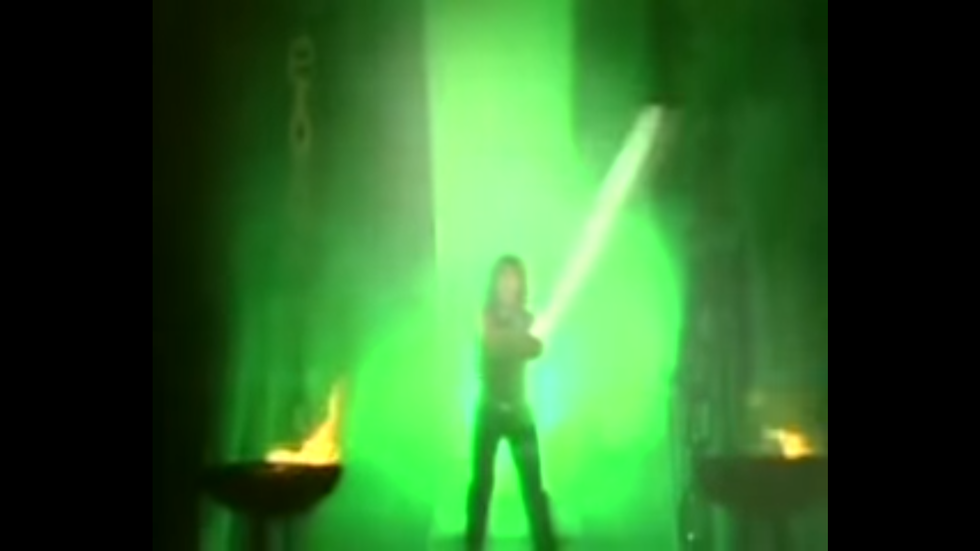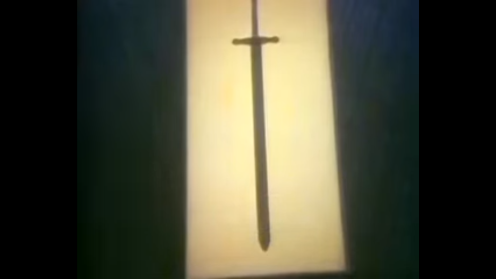 The music video continues fairly normally with the band just playing their song in front of a helpless woman. Until the 2 minute mark, and suddenly there's a sword. Note the length of the sword in the first shot.