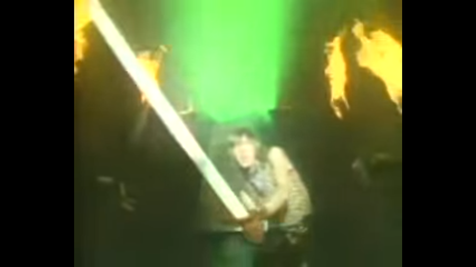 The sword is about the length of the lead singer's height, so roughly 6 feet long. Now look at the next shot.