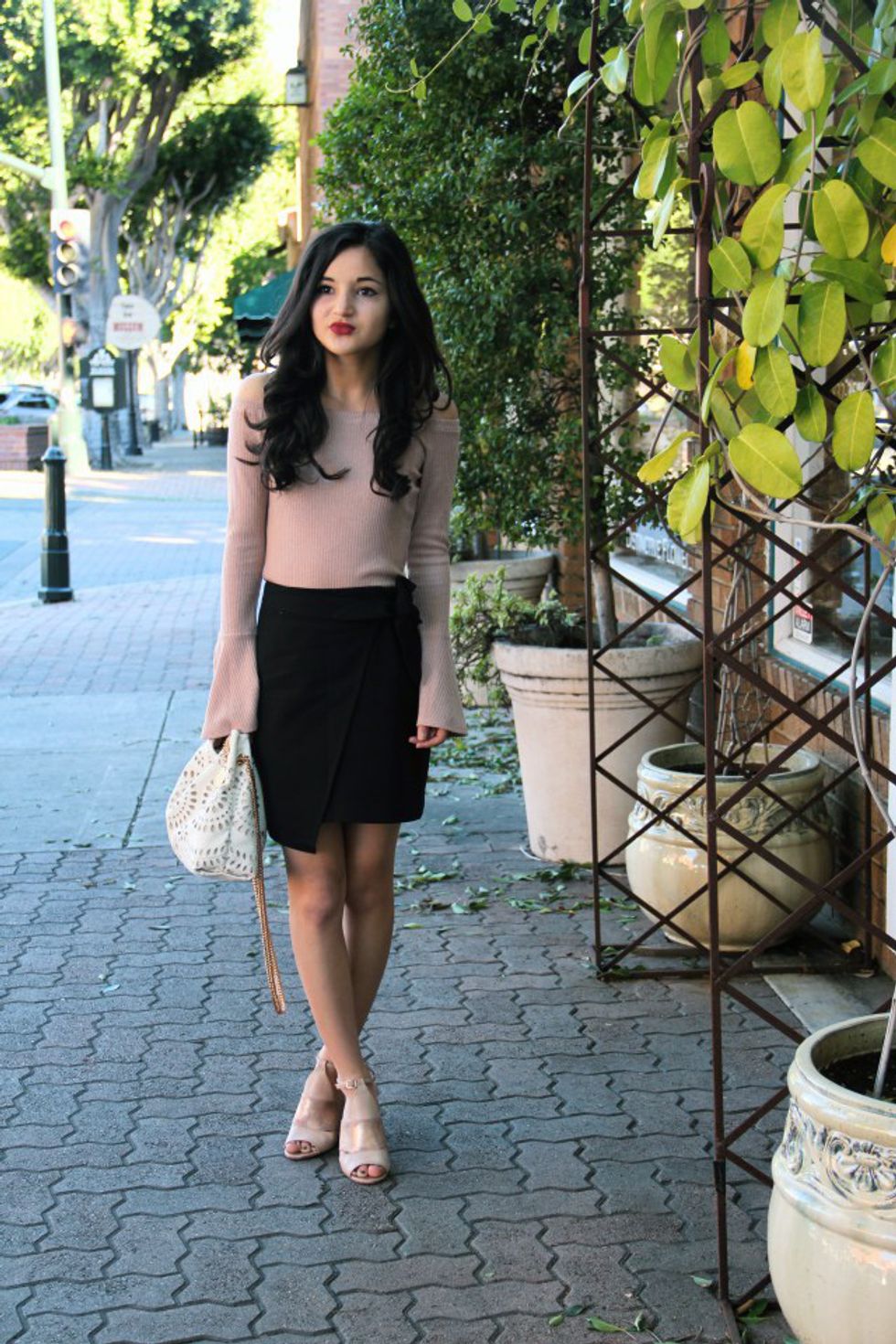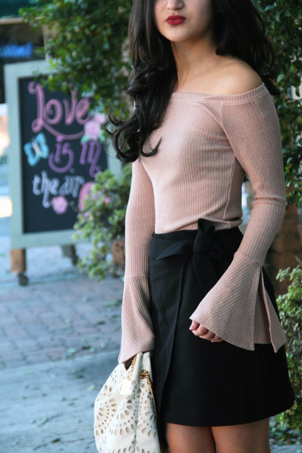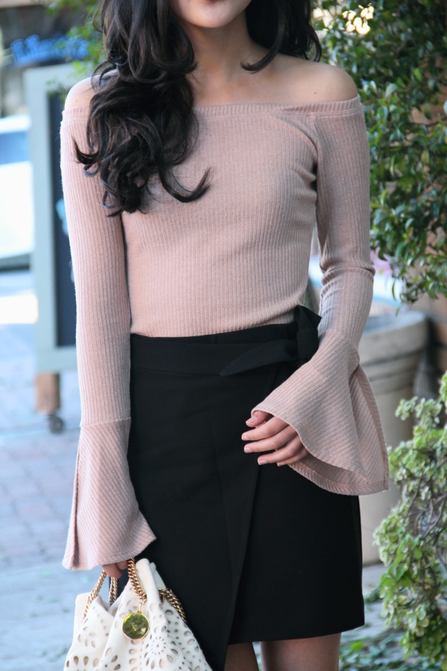 Case in point: this off-the-shoulder sweater I picked up at Nordstrom that walks the line between a dusty blush pink and classic nude. I love the bell sleeves with the slit in the side that allows for range of motion in the arms. I posted a dressing room snap of this to my Instagram story and I got multiple messages asking about the sweater, so I was really excited to publish this outfit. I also picked up this simple black wrap skirt at a score of less than $20- wrap skirts are great for petites because you can adjust the size to your liking. I always have issues with the waists of skirts being loose and needing a belt, so this was perfect and really versatile as well.