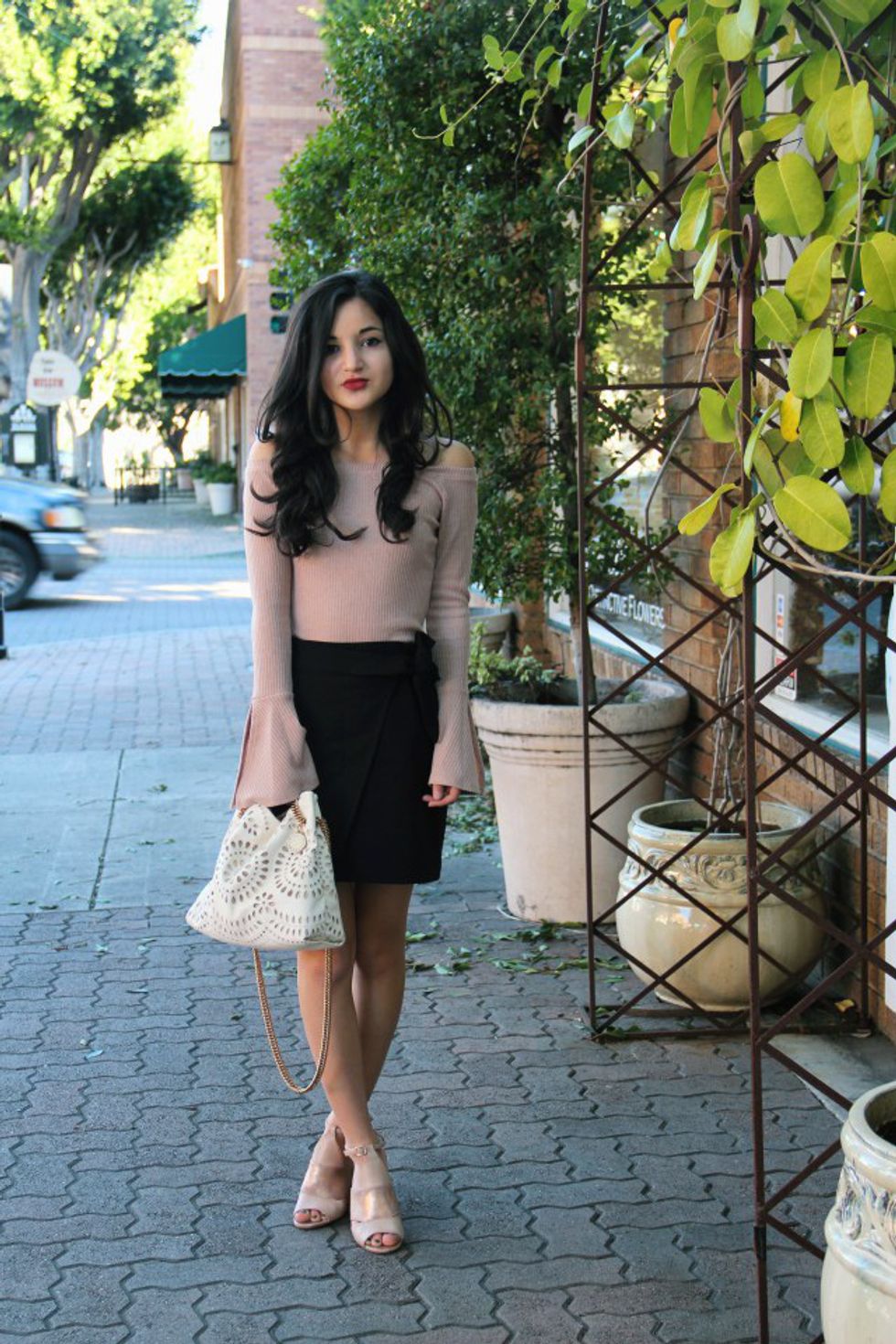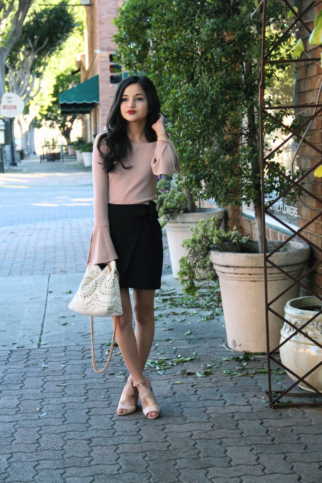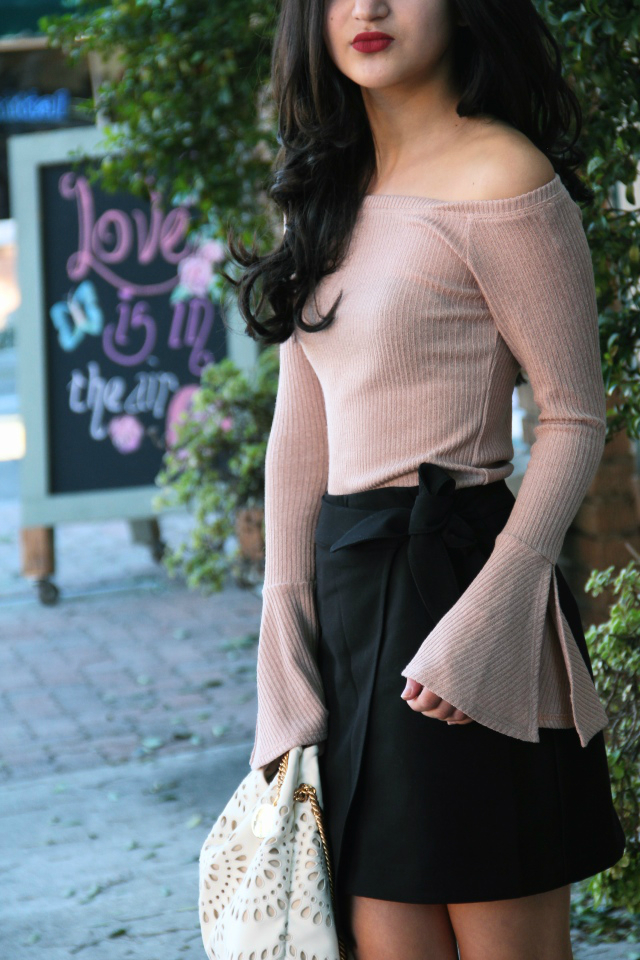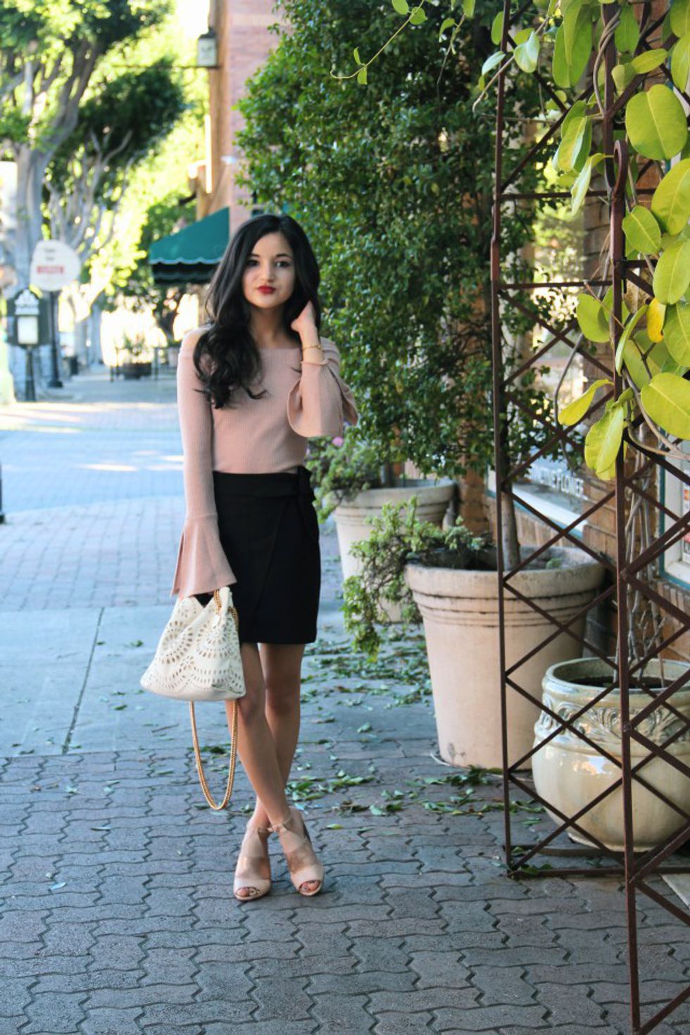 Case in point: this off-the-shoulder sweater I picked up at Nordstrom that walks the line between a dusty blush pink and classic nude. I love the bell sleeves with the slit in the side that allows for range of motion in the arms. I posted a dressing room snap of this to my Instagram story and I got multiple messages asking about the sweater, so I was really excited to publish this outfit. I also picked up this simple black wrap skirt at a score of less than $20- wrap skirts are great for petites because you can adjust the size to your liking. I always have issues with the waists of skirts being loose and needing a belt, so this was perfect and really versatile as well.