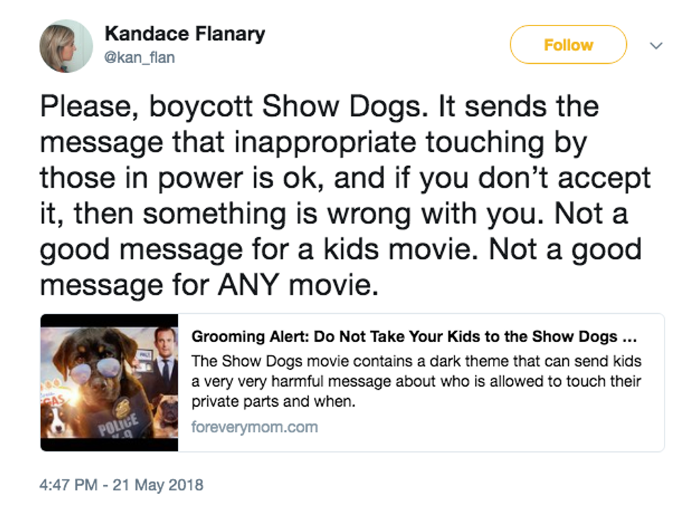 On the surface, the new movie "Show Dogs' looks like a light-hearted comedy for children, but after an early screening, parents began to criticize the new movie, saying it's sending a very dark message to kids. The film is about a police dog who needs to go undercover at a fancy dog competition, but in order to pass for a show dog, he has to get his genitals inspected. Although the ritual is common among these types of competitions, in the movie, Max the police dog expresses his discomfort with the inspection, which becomes a major storyline in the movie.