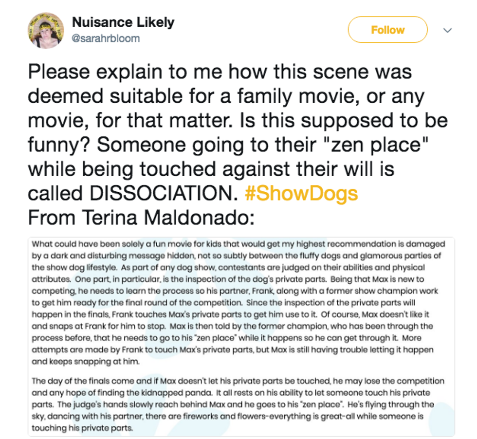 While I think the disturbing message will go unnoticed by kids, I don't believe a scene like that had any place in a children's movie. I also don't see why the filmmakers needed to be so authentic when portraying a professional dog show. You can play devil's advocate and argue that all children's movie have adult undertones, sexual references, and inappropriate jokes, but audiences should never feel that a scene makes light of exploitation, molestation or assault.
