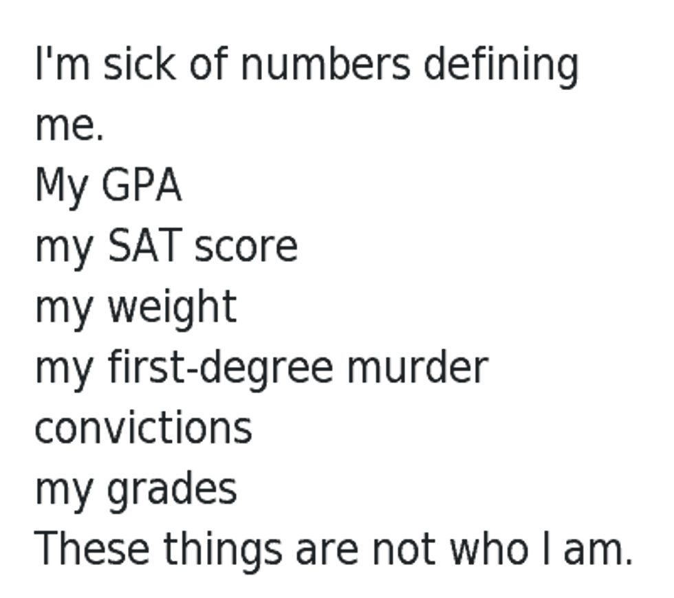 Numbers classified me as ‘overweight’ because for being 5’9 I should have weighed no more than 163, but I weighed 170. They classified me as half the quality, because I was ranked 11th in my class out of 20. They decided that I shouldn’t get any scholarships because my ACT score was only a 20. They decided that I hadn’t worked hard enough in high school because I was only active in two organizations and therefore I didn’t go the extra mile. Numbers were controlling my life. Somehow, they’d been given the power to tell complete strangers that I am not good enough.