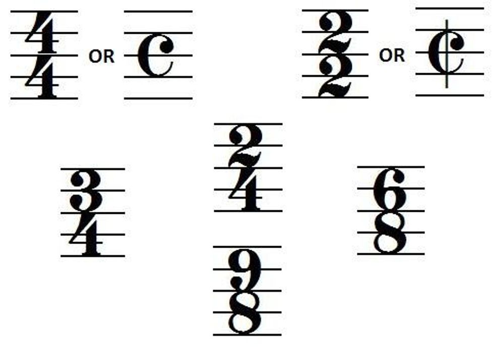 This is another very important thing to look for in a song. These are, in an elementary definition, where the top number is how many are in the measure and the bottom is what kind of note gets the beat (i.e.: 8=Eighth Note, 4=Quarter Note). Also, the composer will likely throw out time changes just to mess with you and make you cry. For example, one of my favorite songs by composer John Zdechlik is "Chorale and Shaker Dance" and will change the key signature every 15 measures, then 4, then 6 and so on and so forth.