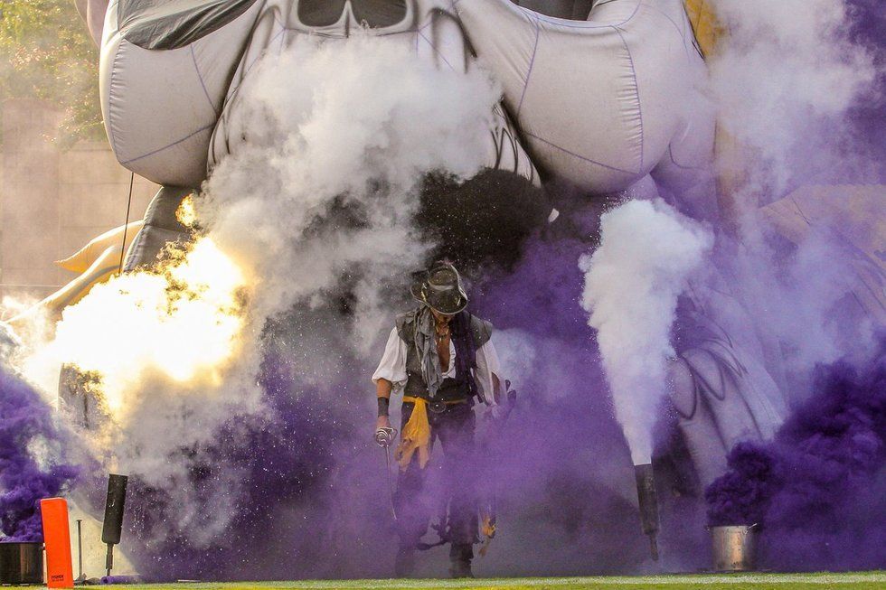 Smoke pours out of a large inflatable skull, adorned with a tricorn hat and eyepatch, as the first few grungy notes of Hendrix's timeless rock anthem rings out. A man steps out of the smoke out onto the field - a coach? No. A player? No. It is a man dressed as a pirate. He throws his replica sword into the ground, tosses his hat into the crowd, and bellows "LET'S GO PIRATES" before running onto the field. Behind him, a rush of bodies dressed in a rich purple sparkle in the sunset.