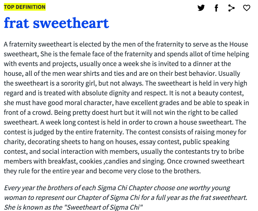 What is a fraternity sweetheart? According to Urban Dictionary it is defined as: