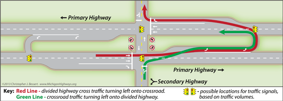 This is something I have only seen in Michigan! It's hard to explain, but we essentially turn around using U-turns instead of at an intersection. My hometown has several of these and I often am confused with how to turn around in other states.