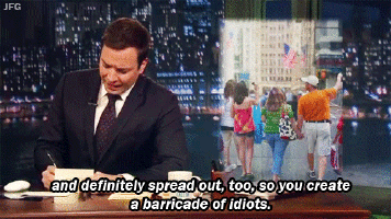 "What are you, barbarians?! Stick to the right lane in a single file line, maintain the speed of traffic of at least 5 miles per hour. Did no one teach you how to walk?!" (OK, so maybe that's just us...)