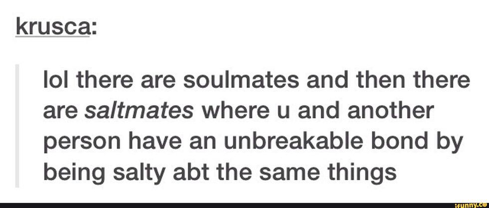 A true saltmate is there through it all. They allow you to be salty when you get a bad grade for something you actually studied for. As well as when you’re favorite show gets canceled. Nothing is too big or too little to be salty about and a true friend knows this.