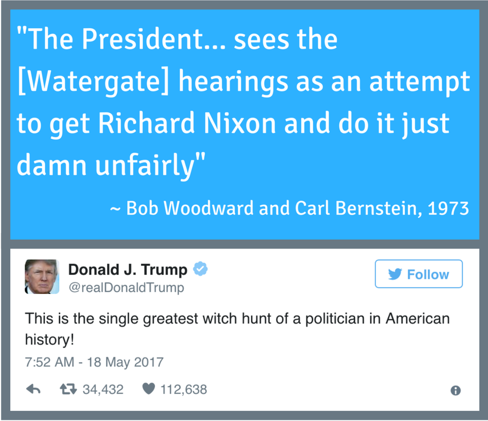 Of course, the efforts of the media to uncover the truth were far from over. Led by the now-legendary efforts of Bob Woodward and Carl Bernstein and their primary informant, then-FBI associate director Mark “Deep Throat” Felt, news outlets uncovered more and more layers in an ever-deepening web of treachery. It's during this period that the parallels between Watergate and Trumpgate are most keenly evident: dismissing an FBI director who knew too much ("Deep Throat" for Nixon, Comey for Trump), approval ratings nosediving, a parade of staff dismissals and disgraced exits, sacrificing key advisors to save face, all while the President continues to claim he is the victim of a witch hunt...