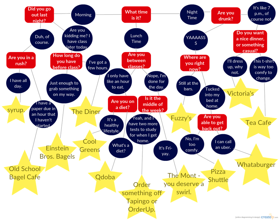 The back and forth gets exhausting, and by the time a decision is made the restaurant is more than likely closed. I've decided that I'm over it. I'm done being indecisive and never having any clue what to eat, no matter what time of day. I've taken it upon myself to design a simple flowchart to help me, and everyone else in the city of Norman, decide what to eat. You're welcome in advance.