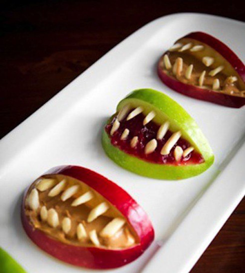 And of course, for you health nuts out there, peanut butter and jelly apple sandwiches. Spread peanut butter and jelly on two sliced apple halves and use nuts or marshmallows to create teeth.