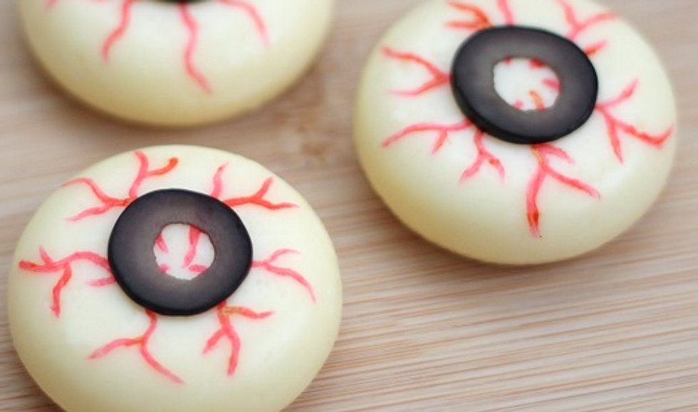 Perhaps the easiest of the recipes I have included on the list, this appetizer is mess free and appealing to the eye. All you need is Babybel cheese, some red food coloring and a handful of fresh black olives. Start by unwrapping each individual cheese wheel from its wrap. Use a paint brush to create veins out of the red food dye, add an olive slice on top and, voila!