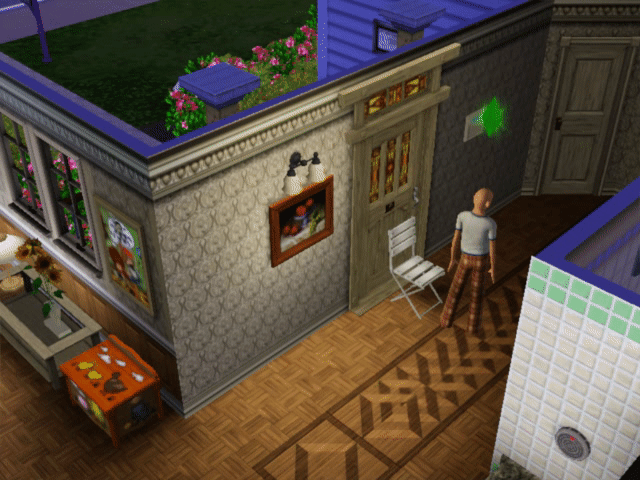 The carpool has arrived to take this Sim to work; observe how he finds himself trapped in the house by a folding lawn chair. Take this into consideration next time you have to attend a class you hate; put a small object in front of your door and spend the next three days stomping your foot and waving in exasperation.