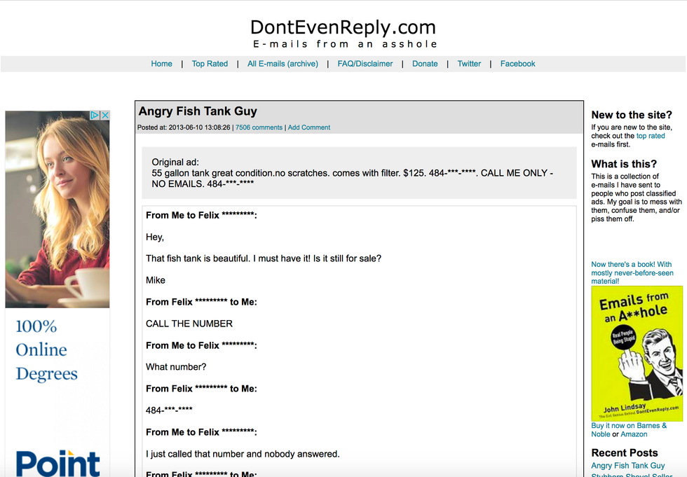 This website hasn’t been updated since the good old days of 2013, but there are so many posts on here I’m sure you’II never get through it all. It’s run by one guy who basically goes on classified ad posts and messes/confuses/pisses off whoever made the post. Then, he posts their correspondences on his website. It’s pretty hilarious and you can almost feel the frustration from the people he is messing with through your screen.