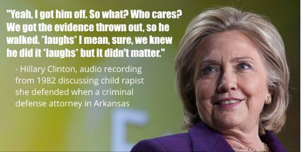 Around fIve years after defending a child rapist, where in the words of the victim “Hillary Clinton took me through hell” she gave an interview where she laughed about how she knew he was guilty. LAUGHED about it.