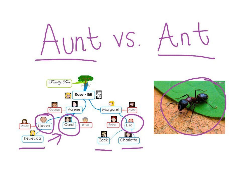 Ant is a bug, aunt is someone that is sisters with one of your parents.