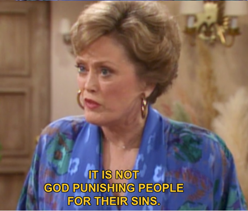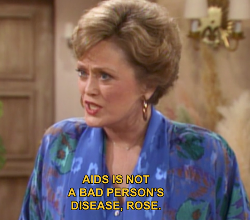 AIDS (Acquired Immunodeficiency Disorder) was the controversial hot topic of this episode. Keep in mind, it bravely aired during the crux of the AIDS epidemic that was running rampant in the LGBT community. After having received a blood transfusion several years prior, Rose (played by THE queen Betty White), finds out she may have contracted AIDS from it. She is in total shock that someone like her, a heterosexual and sexually healthy woman, could have contracted AIDS. She then goes on to stress that she's a good person and doesn't deserve to go through this, after which Blanche (Rue McLanahan) reprimands her, stating that AIDS doesn't make you a bad person.