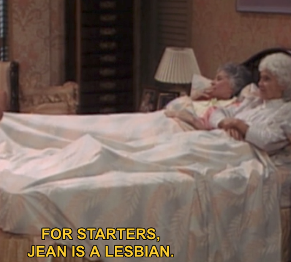 This episode sees Dorothy (Bea Arthur) welcome her friend Jean to Miami. It is mentioned that Jean was recently widowed when her spouse, Pat, died. However, it was unconfirmed until later that Pat was a woman. Throughout her visit, Jean falls in love with Rose and tells Dorothy. This obviously causes some tension in the household because Rose is unsure how to handle it when she finds out, but eventually, they clear the air and Jean wraps up her visit. Exemplifying homosexuality was not uncommon in The Golden Girls. In a later episode, Blanche's brother comes out to her as gay.