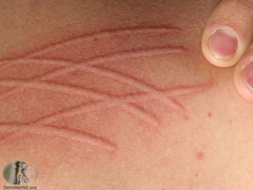 I'm a skin writer! It also known as Dermatographic urticaria if we want to use the scientific term or dermatographia for short. I am among one of the rare people who have this condition since it affects up to 5% of the population. When my skin gets lightly scratched on any part of my body, the scratches redden and become raise kind of like hives. The cause of Dermatographia is unknown unfortunately and can be triggered by infections, other allergies such as in my case, and medications. Symptoms and signs to look for are itching, swelling, hive-like welts can occur anywhere, raised red lines. I've had these pesky, painful scratches turned to welts show up on my arms, behind my knees, and recently on my right lower back/hip. This can last anywhere from a few minutes to several hours and days. Rubbing from clothes or bedsheets can irritate the skin as well. If you need to visit the doctor they will scratch your arm lightly and see if a red swollen line appears within a few seconds to minutes. If it does then the patient has Dermatographia. This happens to me every time I get scratched. The symptoms usually will go away on their own but if it is bothersome then the doctor will prescribe an antihistamine like Benadryl, Allegra, or Zyrtec. To prevent symptoms, refrain from using harsh soaps on the skin, don't wear wool, hot showers can worsen symptoms so take them luke warm, try to avoid scratching though it might be hard it only makes it worse, and keep the skin moisturized with lotion or creams.