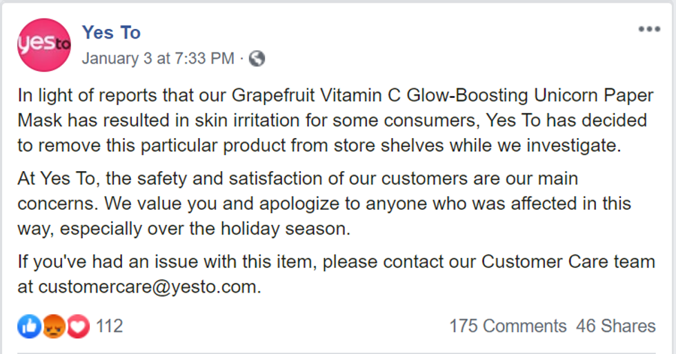 Once the picture went viral, many consumers wrote about their own experiences with Yes To. The company responded by pulling the Unicorn Paper Mask from store shelves. Posting to their Facebook page, Yes To acknowledged that some of their customers had experienced adverse reactions. Customers that did experience skin irritation were told to contact the company's Customer Care team by emailing customer care.