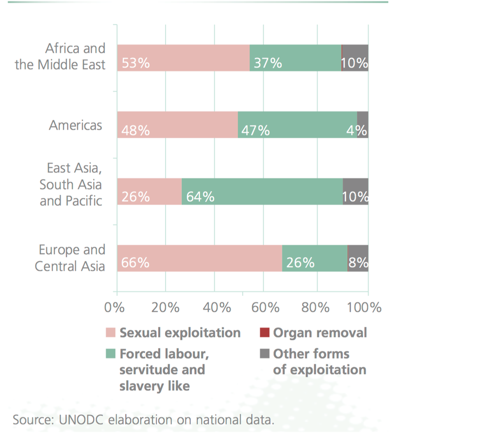 The United States is not the only country affected by this crime. The graphic below shows the breakdown of the different geographical areas of the country with the different percentages of the different ways humans are enslaved and used.