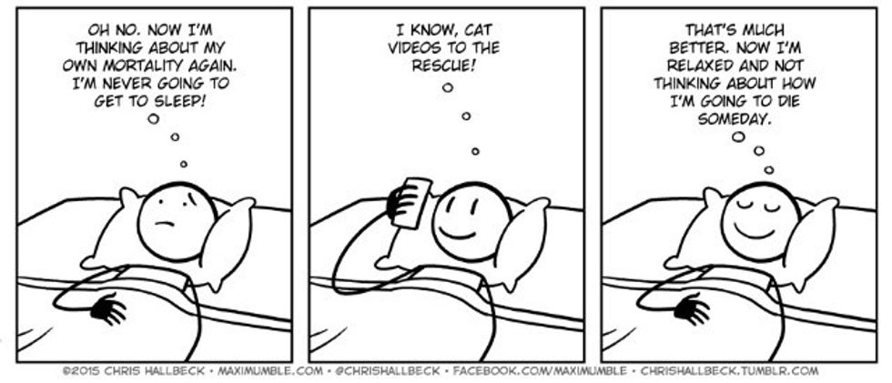 You're finally done with the day. You can finally rest your head on the pillow and relax. Then it hits you like a brick. What is my purpose in life? Am I making the right decisions? What will my future look like? Your best bet is to find something to distract you. Perhaps that book you were assigned, a Buzzfeed article or cat videos.
