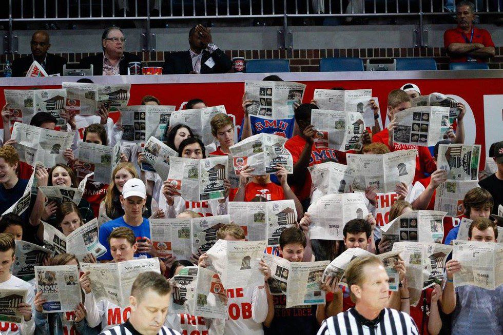 SMU fans have no spirit at all. The basketball team won the American Athletic Conference last year and this is what the fans do in return? The basketball team won 18 games in a row this year with no fan support at all.