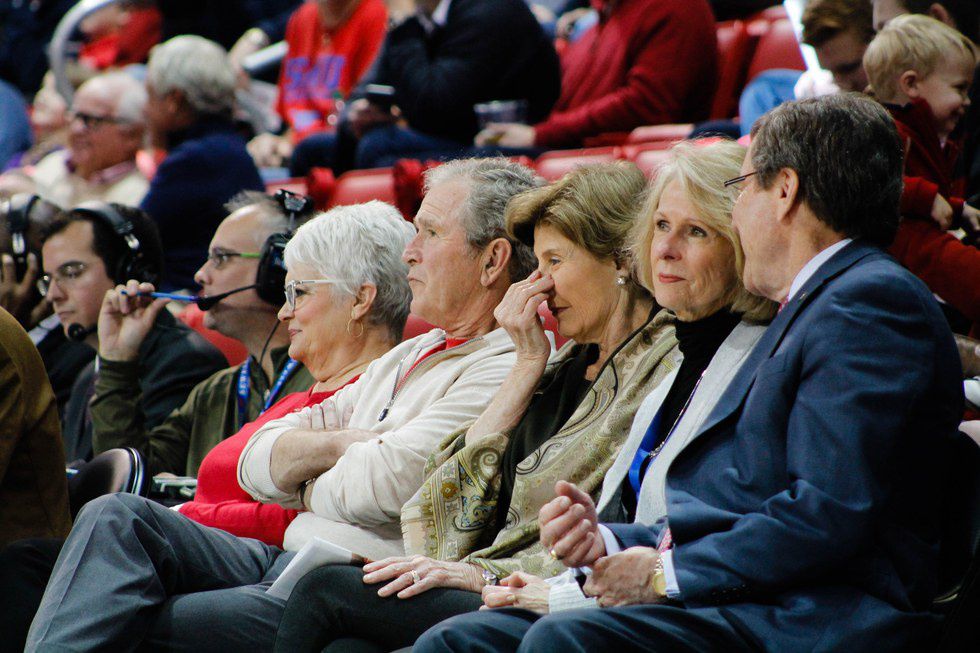 Who cares if former President George Bush has a library on the campus, teaches classes every now and then, and went to almost all of the basketball games. (I have no clue what Laura Bush is doing in this photo.)