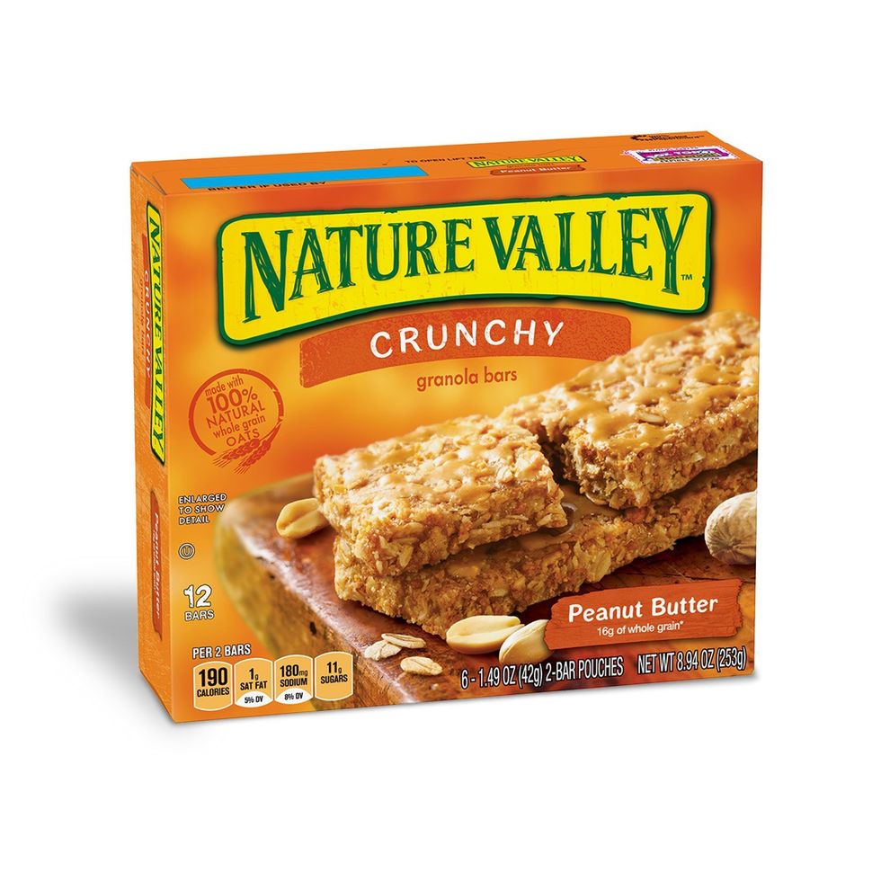 Nature Valley’s peanut butter granola bars are a messy S.O.B. to eat. But they’re delicious. The ingredients include whole grain, oats, sugar, canola oil, peanut butter, brown sugar, baking soda, salt, and soy lecithin.