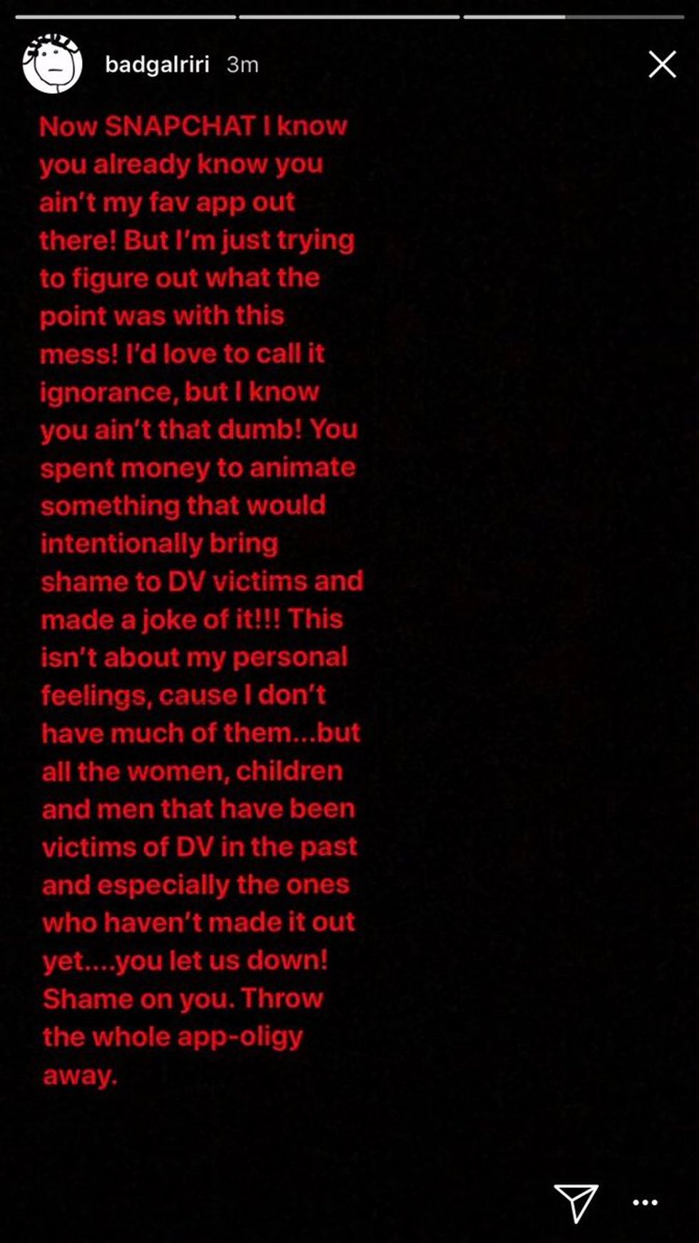 On the bright side, Snapchat has faced consequences for its actions. When Rihanna discovered the ad, she posted this statement on her Instagram story: