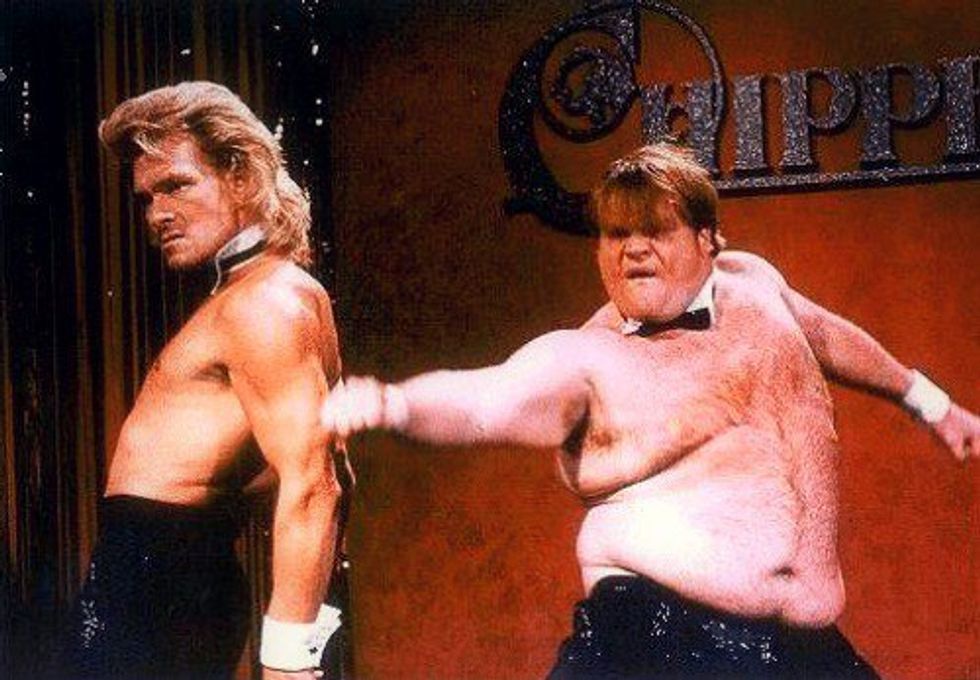 The two compete against each other for a final spot in the famous Chippendale Dancers crew. While Swazye's abs and mullet were a huge fan favorite, Farley stole the show with showing off his self proclaimed “sexy body." This sketch is so famous, you’ll probably see a pair of pledges dress as these two and do the dance around Halloween. Plus, I don’t know whats funnier, Swayze’s Mullet or Farley’s butt crack.