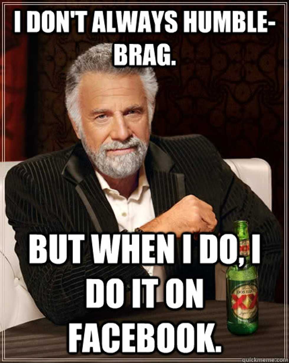 I'm not against Facebook statuses announcing big and exciting news. I'm just against us lying about being humble and about being blessed. If this wasn't such a common practice, then there would not have been a reason for the invention of the phrase, "the humble brag". We are literally bragging about our lives and how awesome we think we are while hiding behind a completely transparent disguise of modesty. So why not be honest with yourself and with the world? You're excited and you did an awesome thing, just say you're excited and happy for yourself. Nothing wrong with being proud, especially when you deserve whatever reward or position you're receiving.