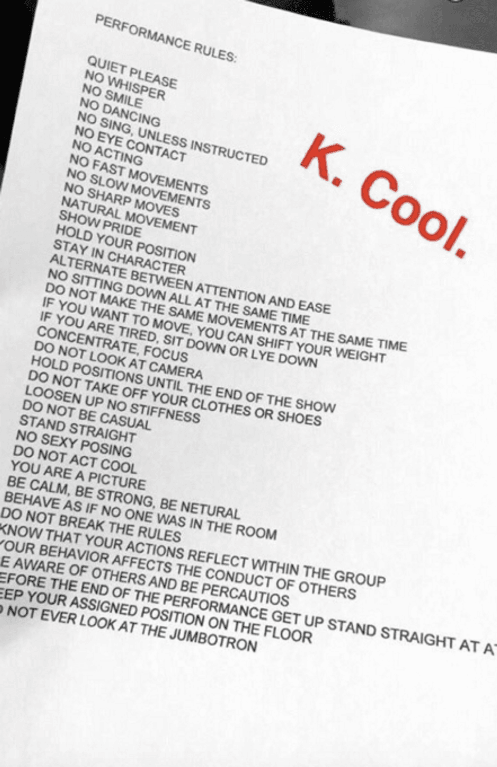 West’s models stood painfully still for the entire performance, one of which included a fur-black-clad Naomi Campbell. After a list of West’s rules for his models was released via Snapchat and Twitter mere hours before the show, we know speaking was forbidden--as were looking at the camera, making eye contact and moving. Most importantly, his list reads “concentrate” and “focus.” “Do not be casual,” West warns. “You are a picture.”