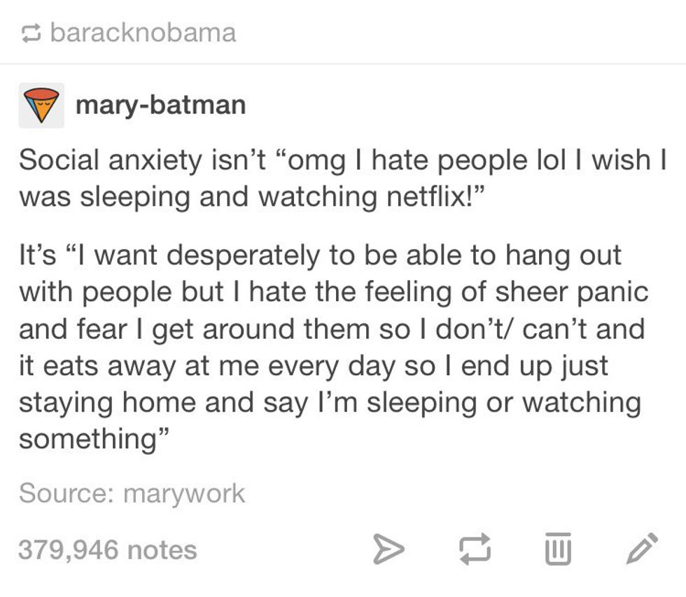 Tumblr is an online blogging platform chock full of people who struggle with anxiety and depression. However, because having anxiety and depression is such a norm online, people have come to pretend to have it to fit in or to feel like a part of a group. Trust me, social anxiety disorder is nothing to be jealous of.