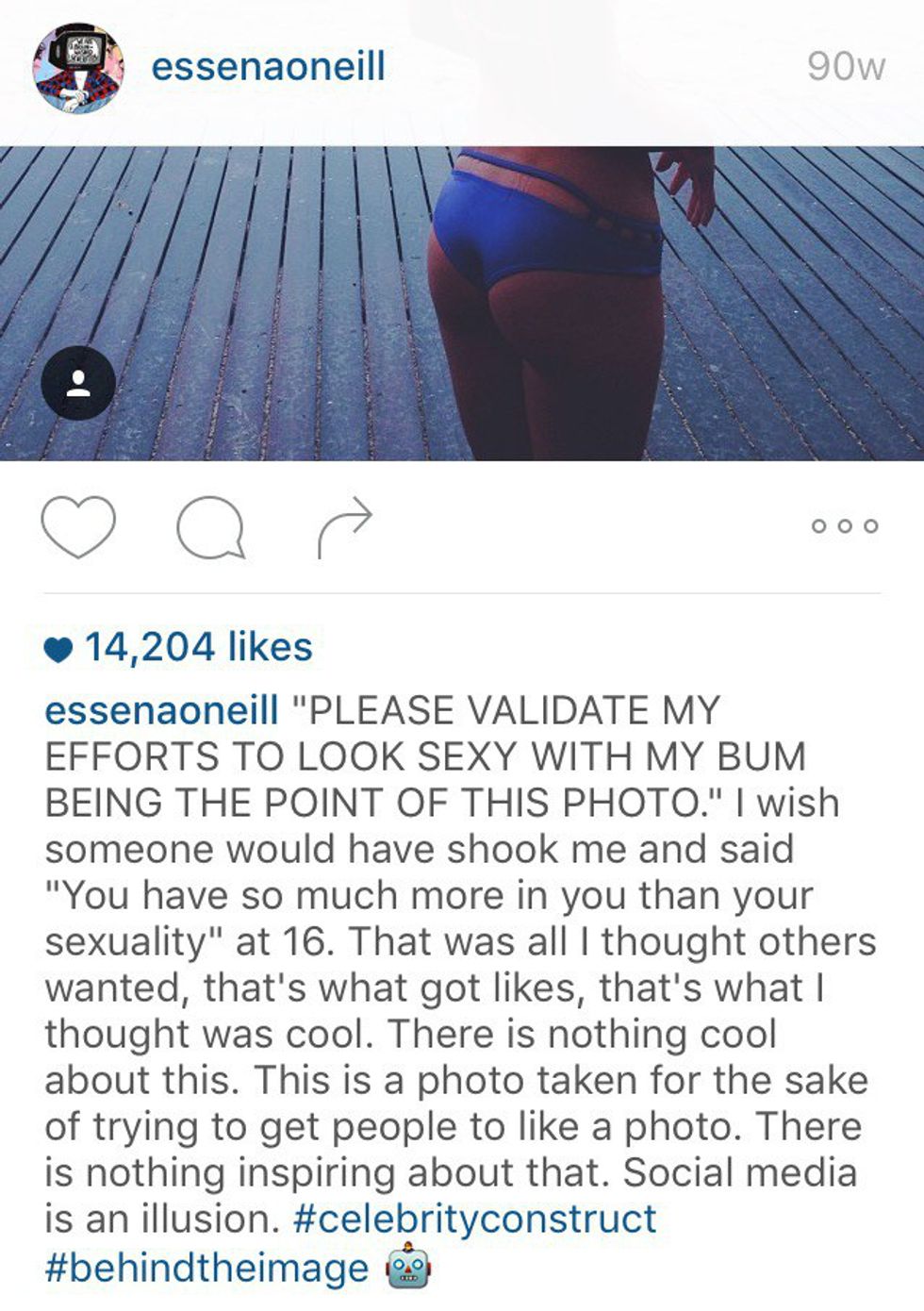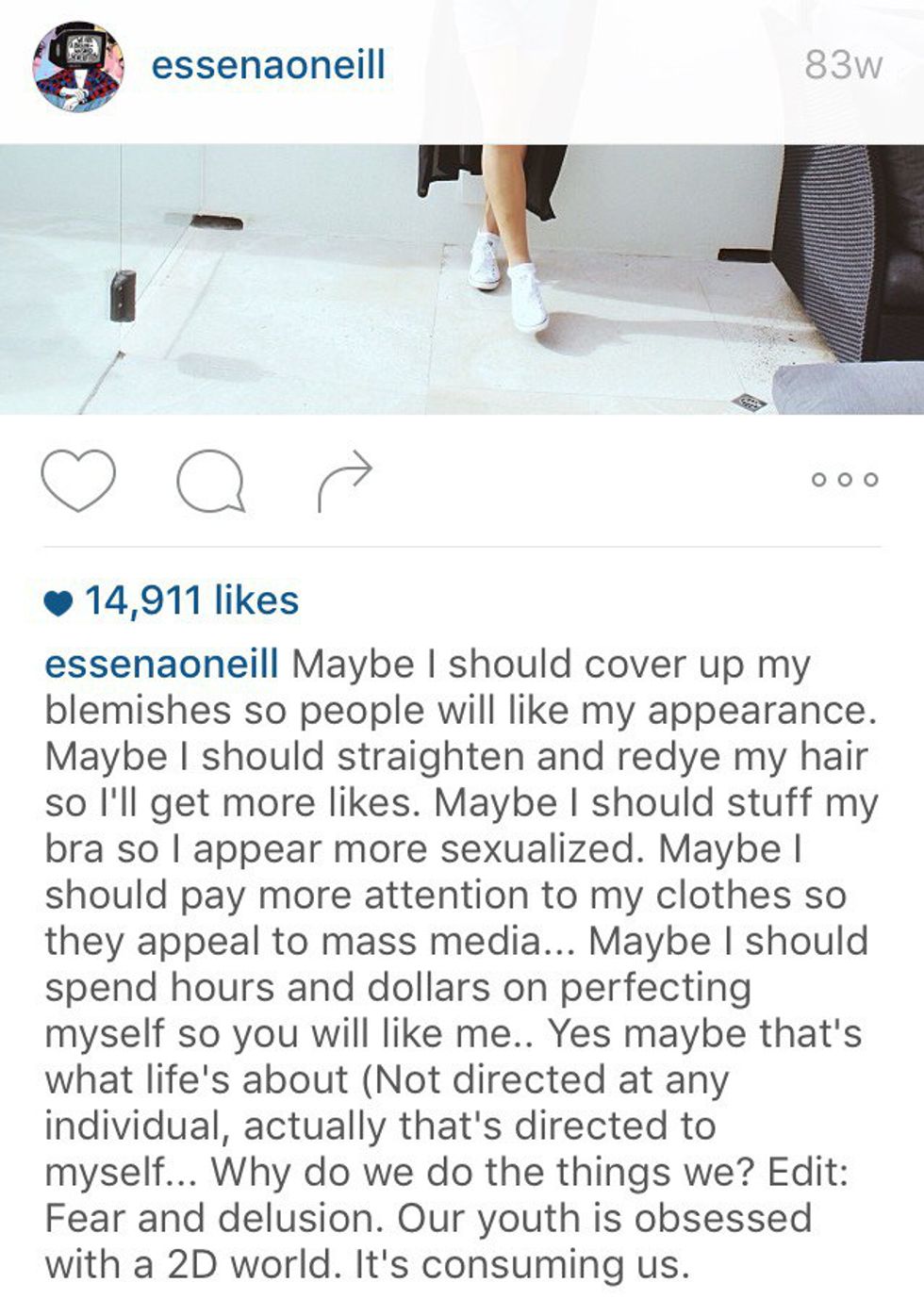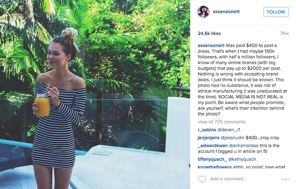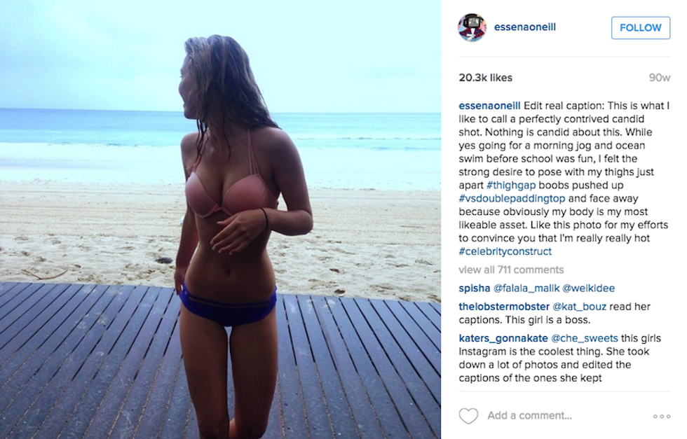 Last week, she made the decision to delete 2000 photos, rename her account to “Social Media Is Not Real Life,” and changed the captions on remaining photos exploiting the sad truth behind each shot. O’Neill discusses how she got paid hundreds to thousands of dollars by brands to post photos with their product, how many tries it took to get a shot she was happy with, and all the pressure she felt to look and be perfect, many times stating that her photos are "not real."