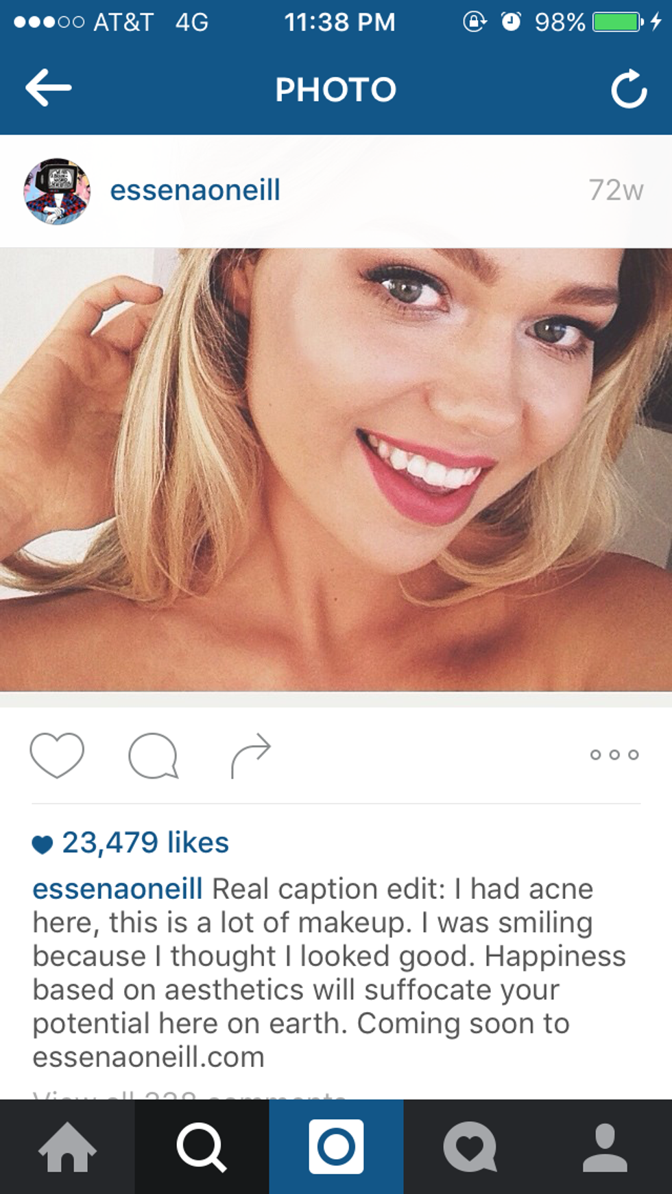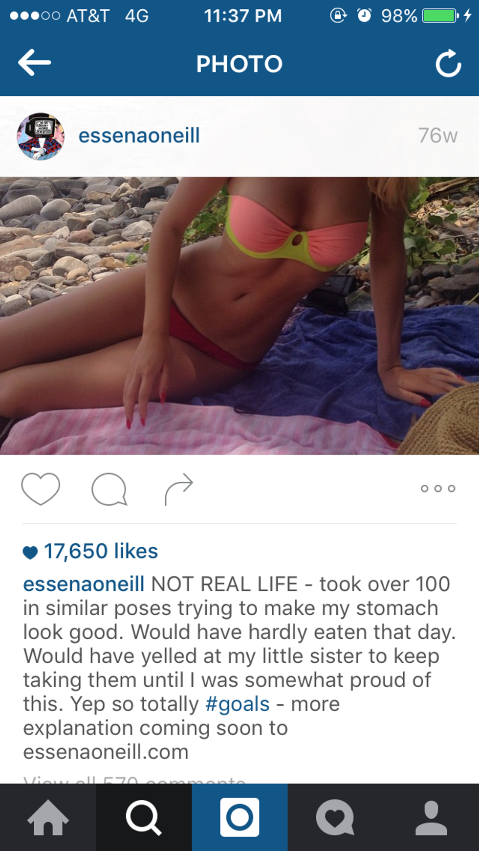 The 19-year-old had over 600,000 followers on Instagram and YouTube before she decided to "quit" social media. In her YouTube videos leading up to her announcement, O'Neill began to open up about the dissatisfaction she felt with social media and was struggling to find a way to authentically promote herself and her brand. In a final act to reveal what she felt was the problem with social media, Essena changed all the captions on her Instagram photos to reveal what was going on behind the scenes in these photographs that people commented things #bodygoals and #inspo.