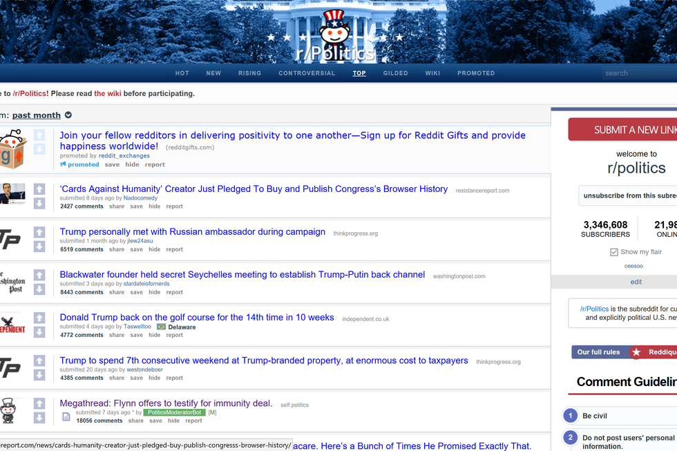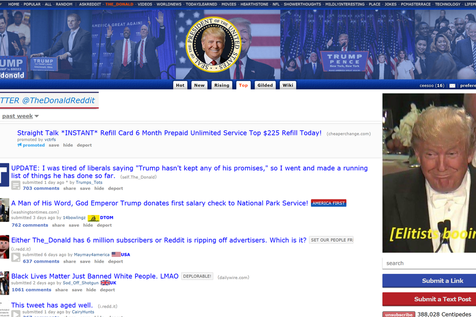 There is another subreddit on Reddit that is full of Donald Trump supporters. Like the politics subreddit, this one praises Trump and criticizes anything that relates to the Democratic party. Within both of these subreddits, topics about social justice are quite common because they are heavily influenced by politics. One side may be for a certain social justice issue and will only talk about the positive things about it while not discussing the negatives. The other side will criticize it and talk about their opinions on social injustice and why their view is the correct one.