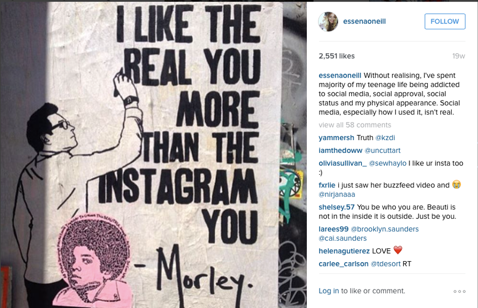 Essena O'Neill, teen Instagram star and model, decided to quit social media for good earlier this year, despite the fact she was making a living off her accounts and had a following of more than half a million. She spoke out against it, revealing that her pictures were not an accurate representation of her or her life. She stated, "I was consumed by it. I wasn't living in a 3D world. So many people strive to be popular online to validate themselves, manipulating photos and captions to give the idea they are happy just to get followers and be 'idolized'."